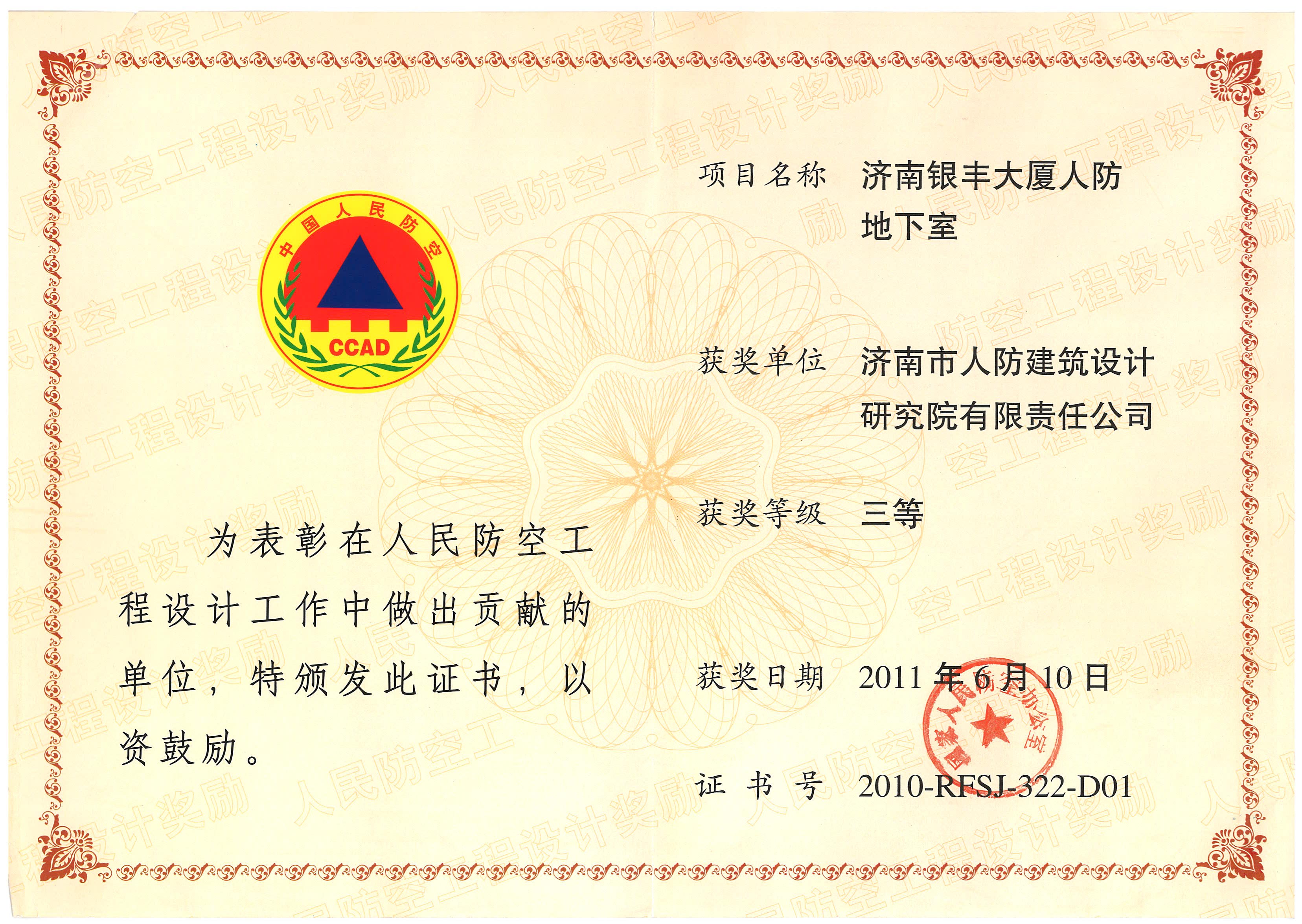 濟南(nán)銀(yín)豐大(dà)廈人(rén)防地(∞↓≤dì)下(xià)室項目獲得(de)三等獎π"→¶