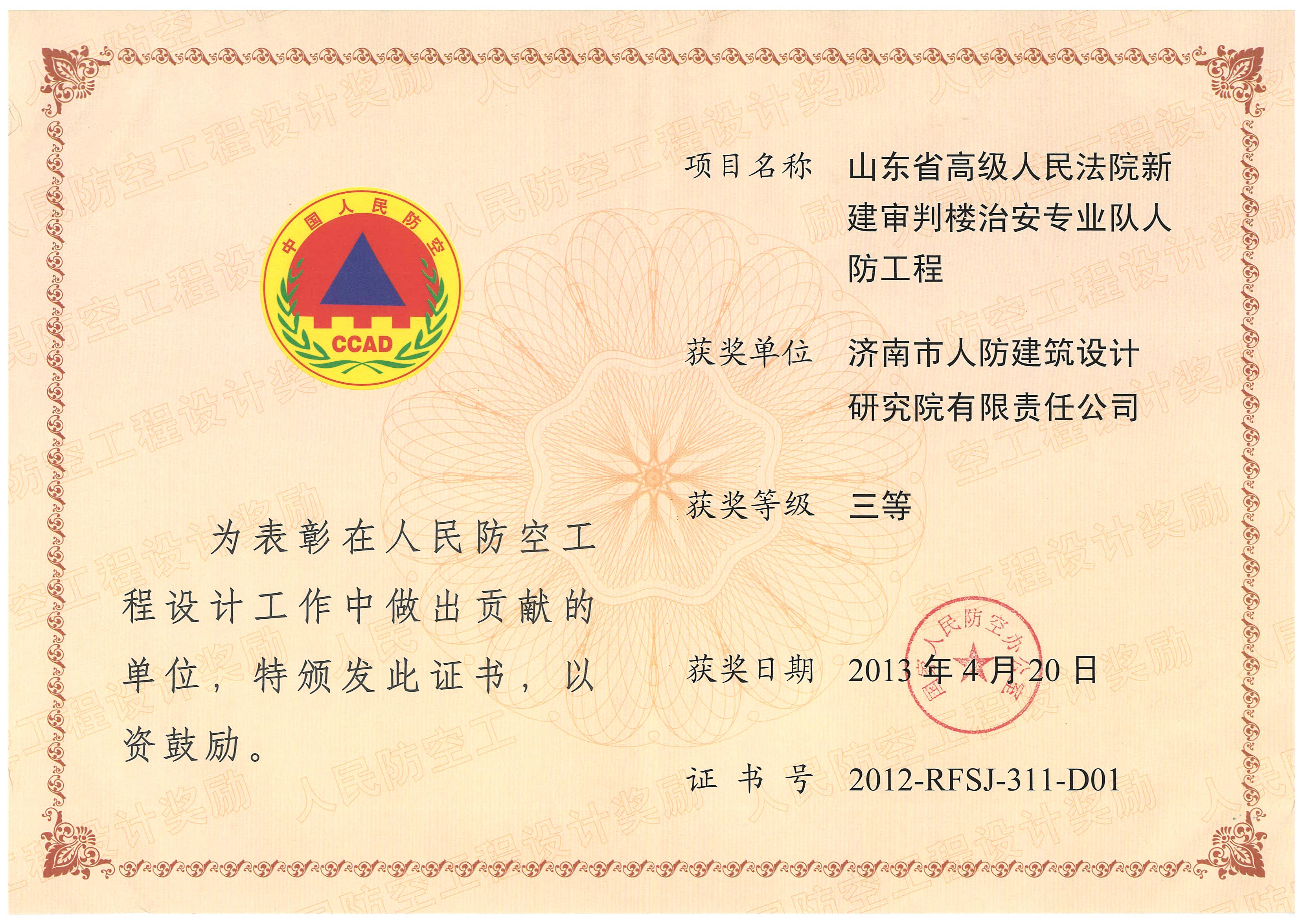山(shān)東(dōng)省高(gāo)級人₹♦λ(rén)民(mín)法院新建審判樓治安專業(yè)隊人(rén)防工(®σgōng)程獲得(de)三等獎