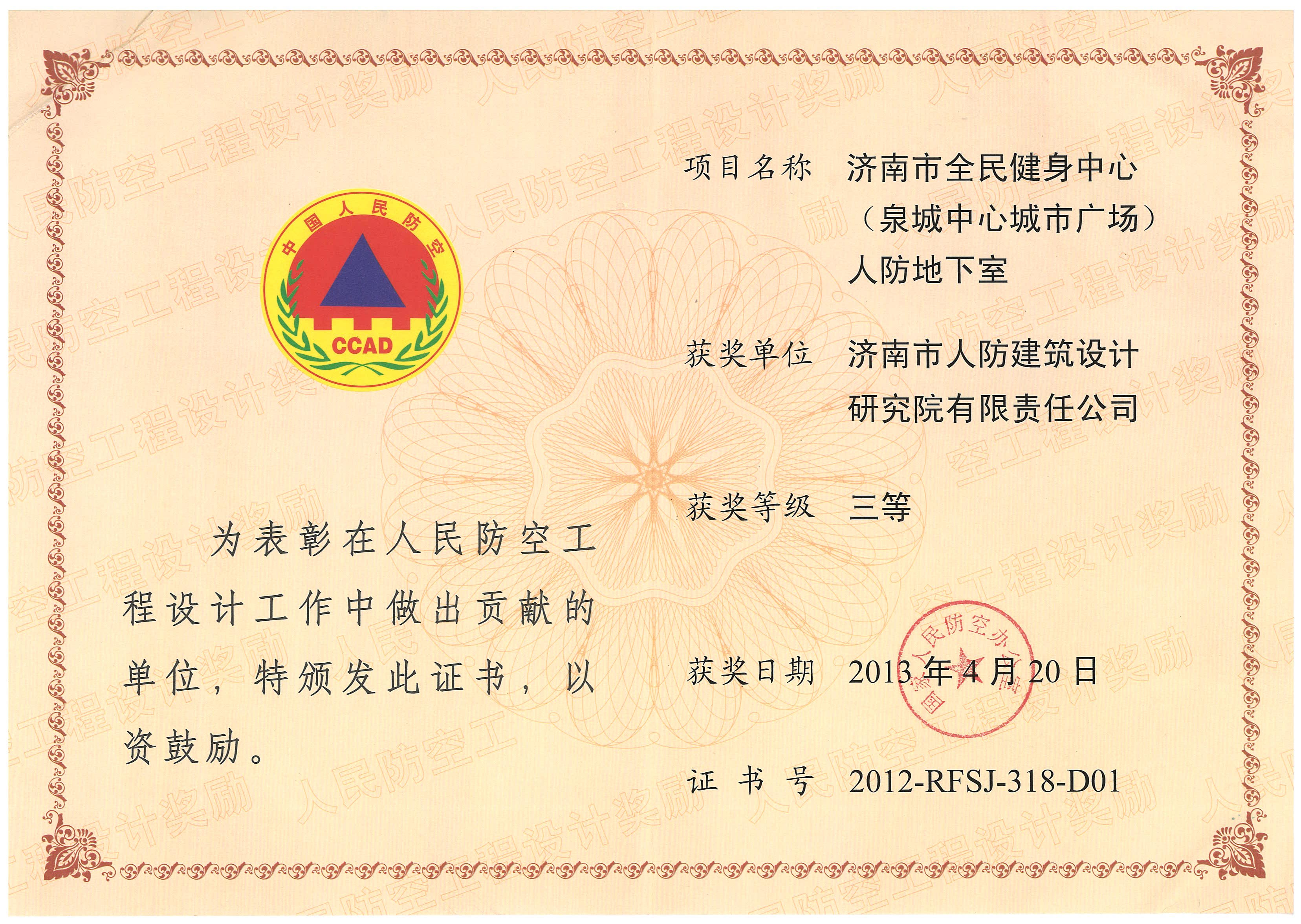 濟南(nán)市(shì)全民(mín)健身(shēn)中心人(r'∑≈én)防地(dì)下(xià)室項目獲得(de★")三等獎