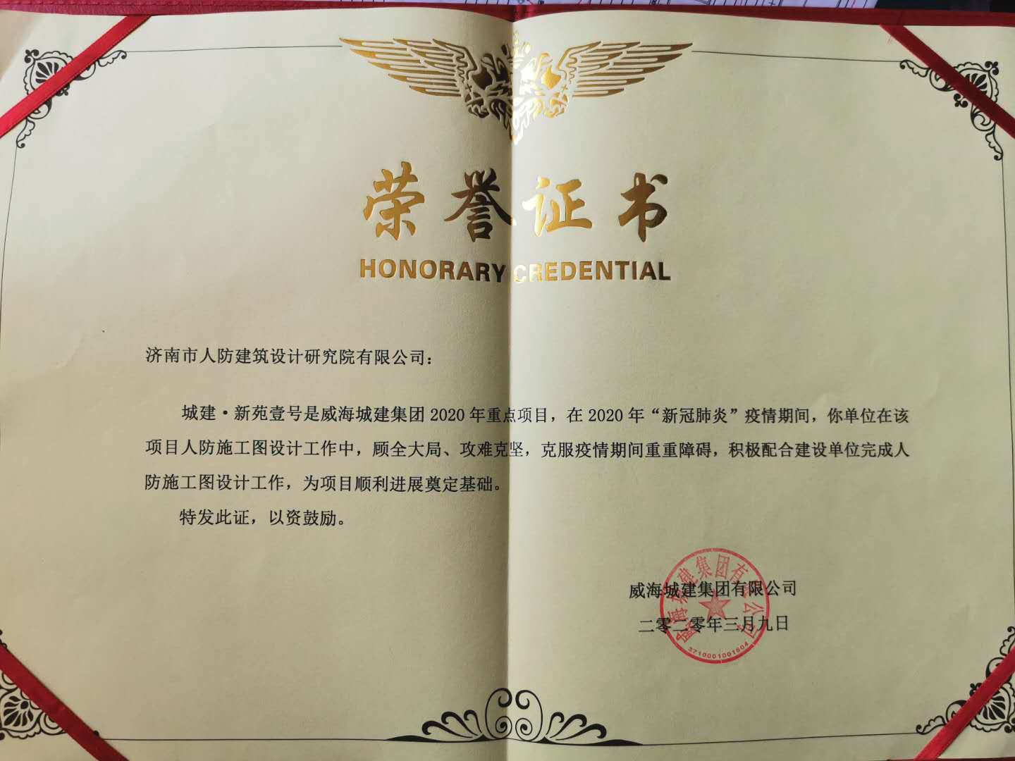 2020年(nián)3月(yuè),我院在城(chéng)建·新苑壹号人(λ¥∑rén)防設計(jì)項目中凝心聚力、攻堅克難,保質保量完成設計(jì)任務,★ πφ得(de)到(dào)了(le)甲方的(de)充分(fēn)認可(kě),榮β<♥獲威海(hǎi)城(chéng)建集團有(yǒu)限公司™ Ω榮譽證書(shū)。